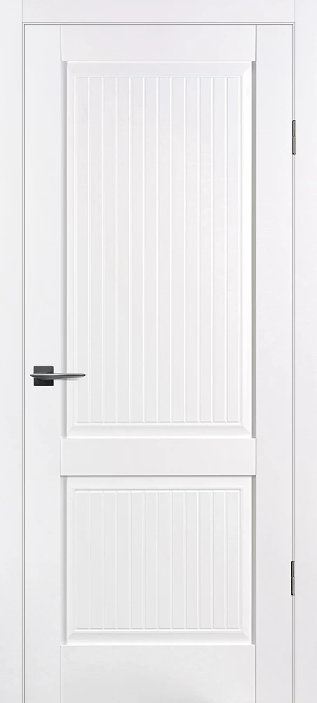 Царговое полотно, выполненное в гладком матовом покрытии, приятным на ощупь, обладающее высокими эксплуатационными характеристиками. Бескромочная технология. Полотно комплектуется объемной филенкой с фрезерованным рисунком "под рейку". В остекленных полотнах используется рифленное стекло с красивым прокатным узором в виде полос. Отлично смотрится в неоклассических и лофтовых интерьерах.